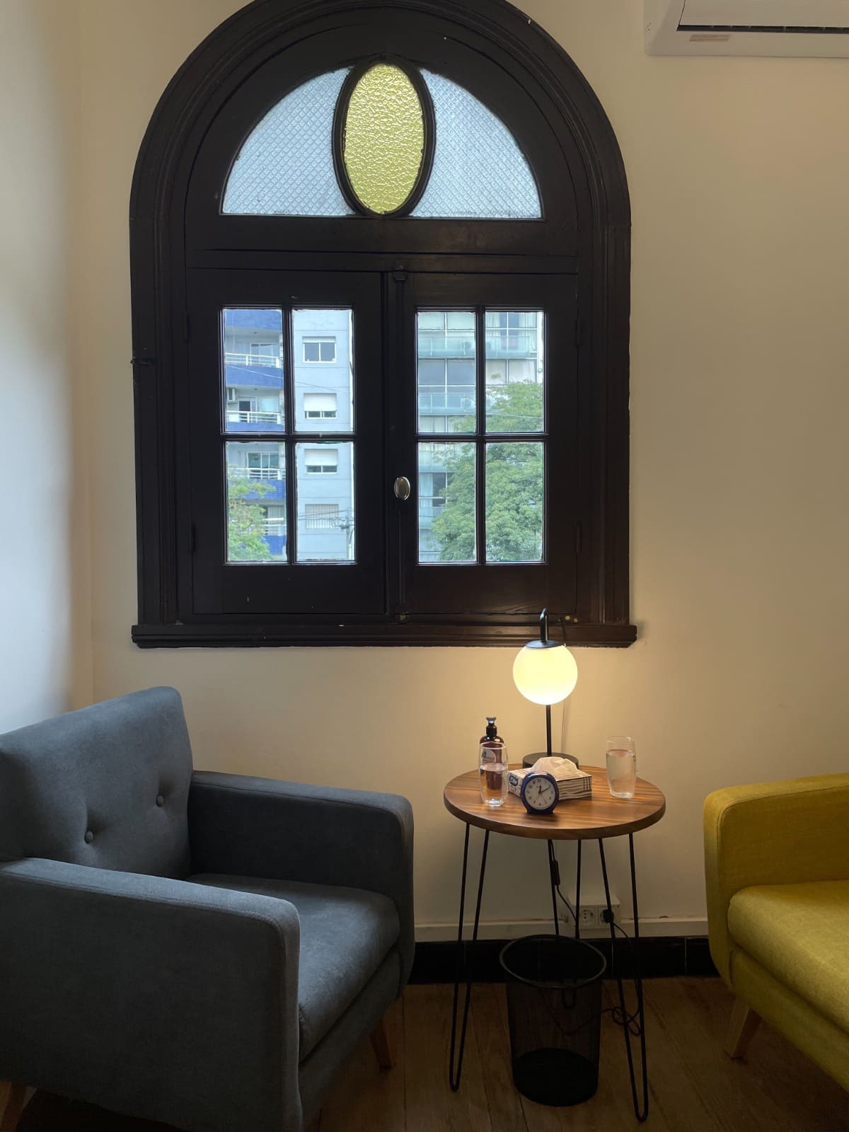 La sala Delmira Agustini ofrece un ambiente sofisticado y cómodo con dos sillones de un cuerpo, dos sillas y un escritorio, perfecto para reuniones y consultas. Está equipada con una mesa auxiliar, ventana, aire acondicionado, lámpara de techo y lámpara de escritorio. También dispone de pañuelos, alcohol en gel y un reloj, asegurando que todos los detalles estén cubiertos para una experiencia completa.