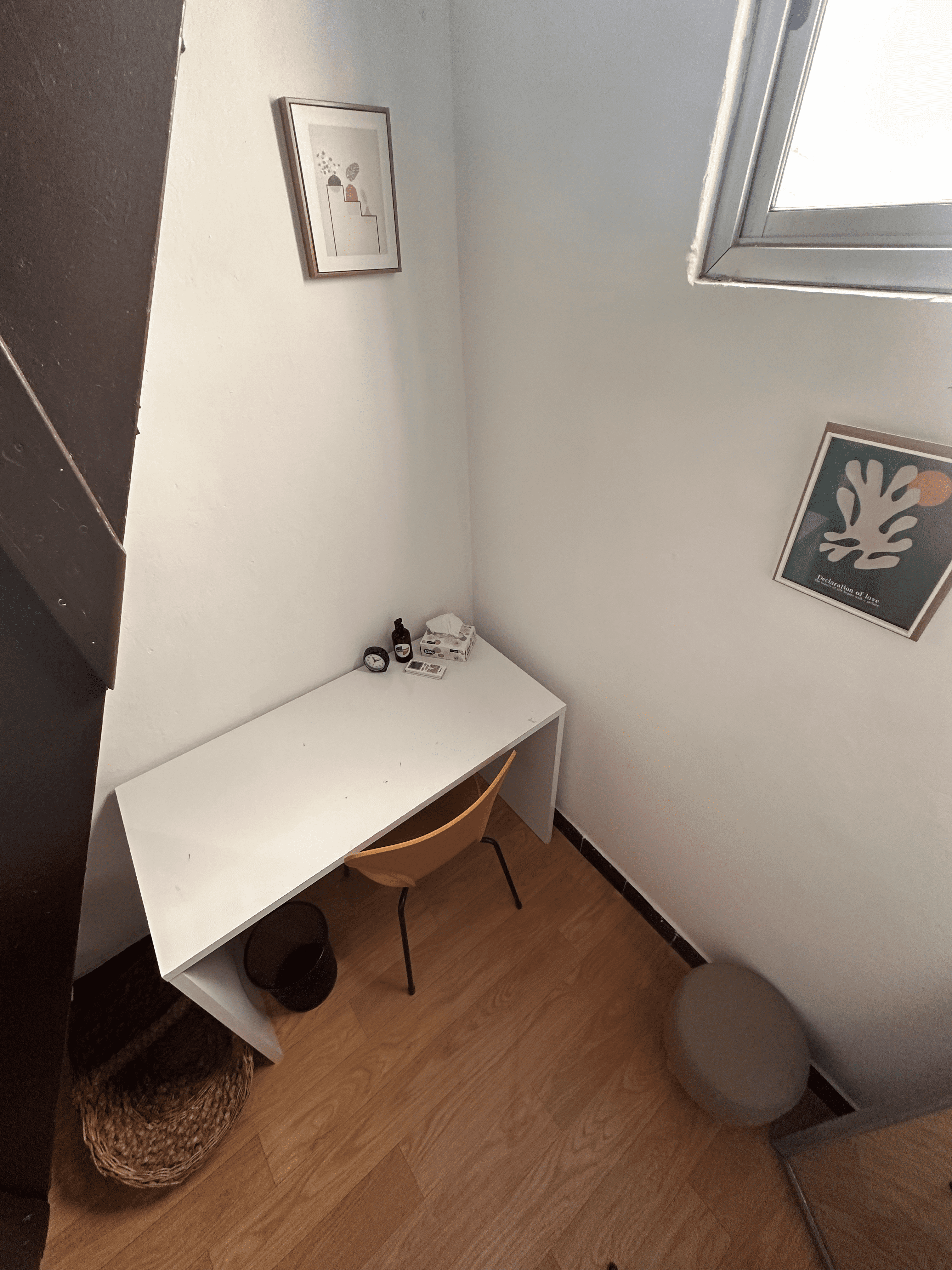La sala Juana de Ibarbourou es un espacio especializado, ideal para profesionales que requieren un entorno para tratamientos. Cuenta con un escritorio, dos sillas, un perchero, y una mesa auxiliar. Para el confort y la atmósfera, dispone de aire acondicionado, una lámpara de techo dimerizable y una lámpara de sal, así como una alfombra y un espejo para un toque extra de calidez. También incluye pañuelos, alcohol en gel y un reloj, asegurando un entorno profesional y cuidado.