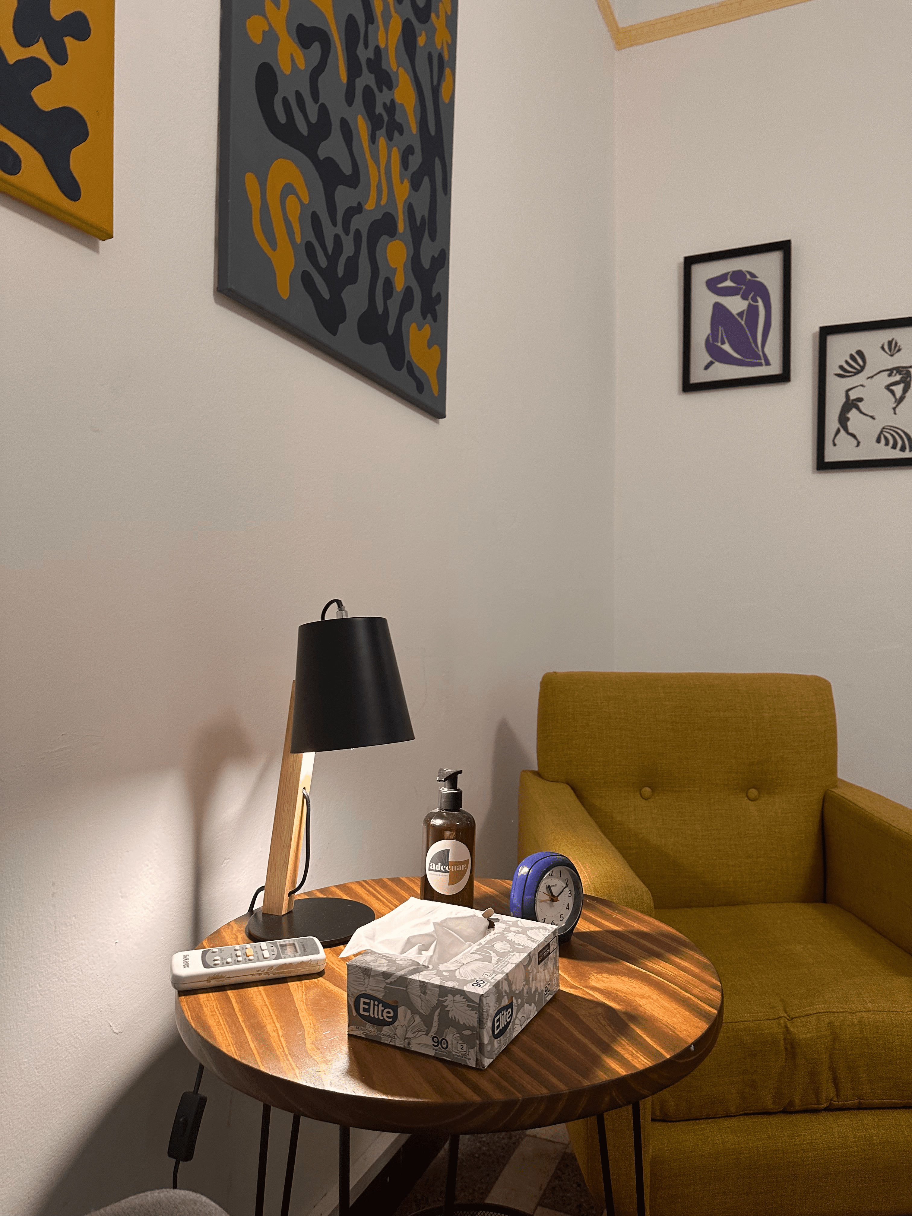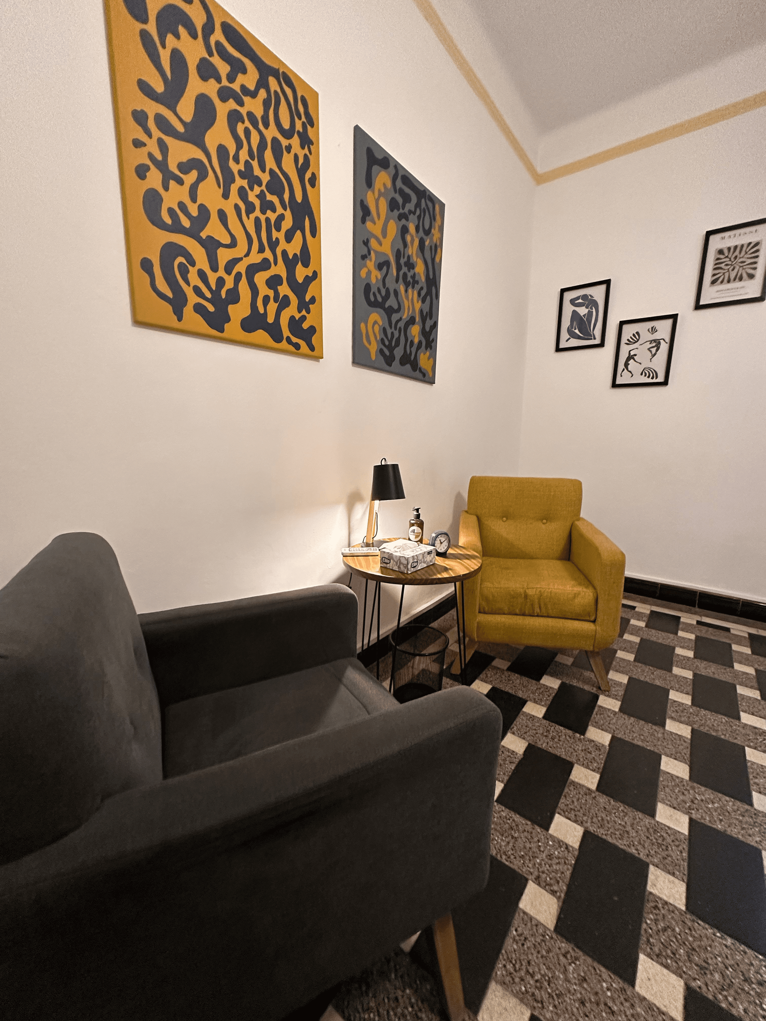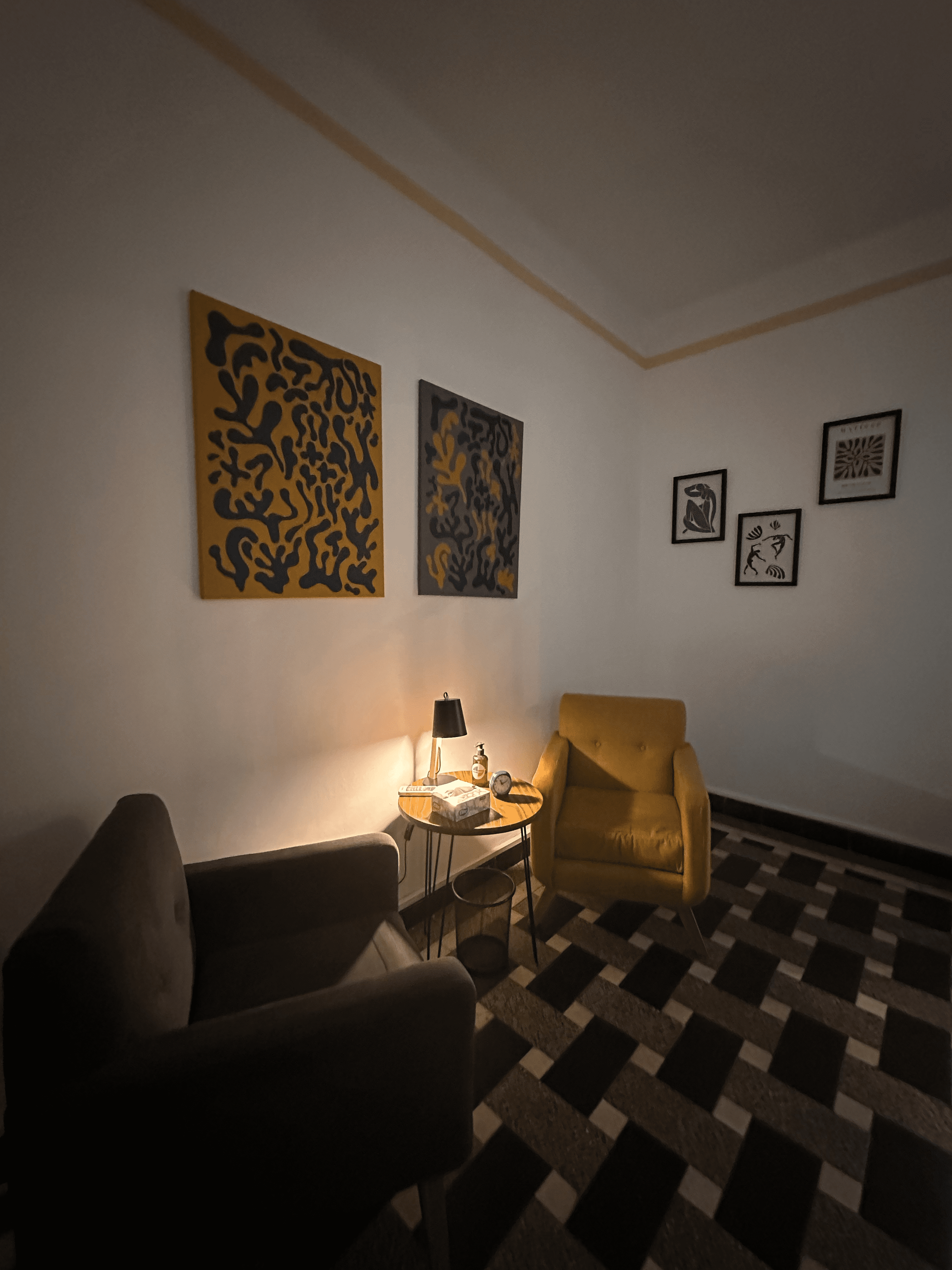 La sala Petrona Viera está diseñada para adaptarse a diversas necesidades, con dos sillones de un cuerpo, cuatro sillas y un escritorio, ideal para sesiones grupales o individuales. Incluye una mesa auxiliar, aire acondicionado, lámpara de techo y lámpara de escritorio para una iluminación adecuada. Adicionalmente, cuenta con pañuelos, alcohol en gel, un reloj y una pizarra, proporcionando un entorno versátil y bien equipado.