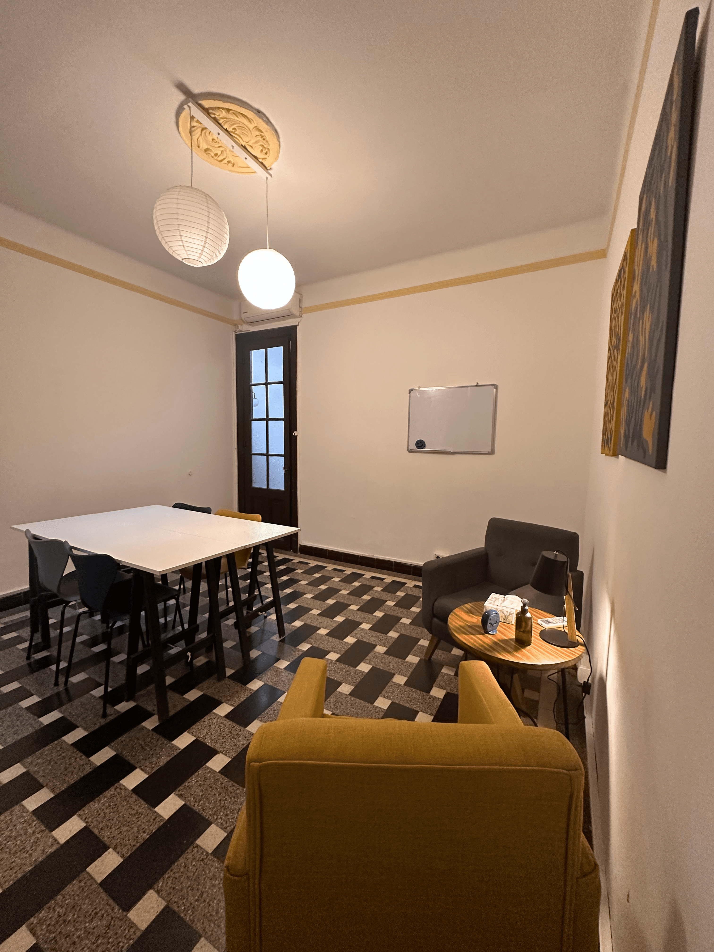 La sala Petrona Viera es ideal para sesiones grupales, equipada con dos sillones, cuatro sillas, y un escritorio. Incluye aire acondicionado, iluminación adecuada, una pizarra y detalles prácticos como pañuelos, alcohol en gel y reloj.
